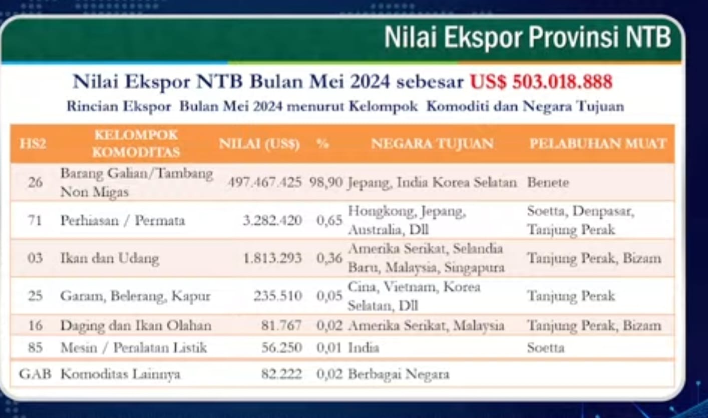 Poinr release adalah Neraca Perdagangan Provinsi NTB pada Bulan Mei 2024 mengalami surplus sebesar US$ 404,14 juta.